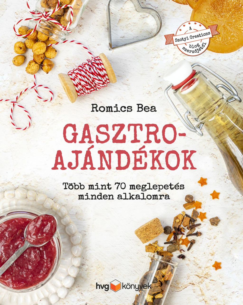 Ha igazán egyedi, feledhetetlen meglepetéssel szeretnéd elkápráztatni szeretteidet, akkor ajándékozz ízélményt! Többé nem okoz fejtörést, milyen egyedi, személyre szóló és könnyen elkészíthető gasztroajándékkal rukkolj elő. Legyen szó gyerekzsúrról, baráti összejövetelről, ünnepi alkalomról vagy karácsonyi figyelmességről, a könyvben található több mint 70 ötlet között mindenki megtalálhatja a kedvencét. Illatos fűszerkeverékek és olajok kecses üvegekbe zárva, a nyár ízeit idéző, különleges lekvárok, csatnik az egzotikus ízek kedvelőinek, melyek remekül illenek a házi pástétomokhoz is. Likőrök, édes és sós kekszek, karamelles ínyencségek és karácsonyi finomságok változatos palettájáról választhatsz. Az ízlésesen csomagolt gin-tonik bonbonnak vagy a Baileys-trüffelnek egyetlen felnőtt sem tud majd ellenállni, ahogyan a gyerekek sem a házi készítésű gumicukroknak vagy a szivárványtortának.De ami a legfontosabb: bátran kísérletezz az ízekkel, és ne feledd el megajándékozni magadat sem!„Az egyik legjobb dolog az, ha valami finomsággal kínálhatod meg azokat, akiket a legjobban szeretsz!”Romics Bea közel 10 éve indította útjára a Szotyi Creations blogot, ekkor kezdett el recepteket fejleszteni és ételfotózással foglalkozni. A hobbiból szenvedély, majd hivatás lett.